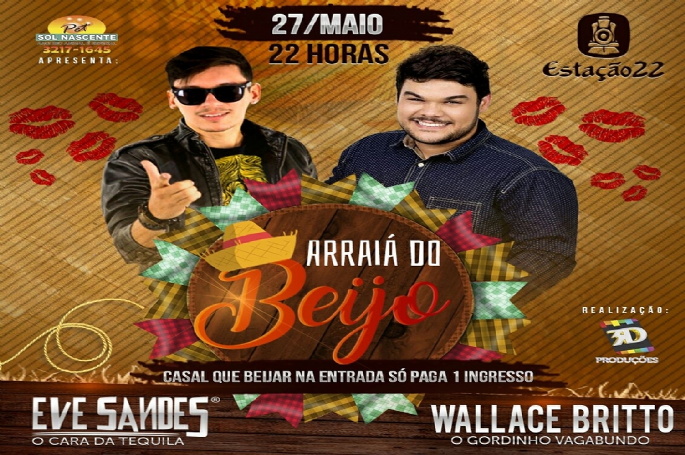 Os cantores Eve Sandes e Wallace Britto vão comandar o Arraiá do Beijo. A festa acontece neste sábado, 27, a partir das 22h, no bar Estação 22, que fica no bairro Inácio Barbosa. Os ingressos estão à venda na portaria do evento. O casal que beijar na portaria pagará apenas um ingresso. Informações podem ser obtidas por meio do telefone (79) 991297824.