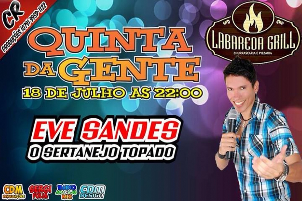 Eve Sandes, o sertanejo topado, comanda a Quinta da Gente do Labareda Grill. Considerado artista revelação de 2012, Eve traz um show descontraído e irreverente com o melhor do sertanejo universitário. O evento acontece no dia 18 de julho, a partir das 22h.