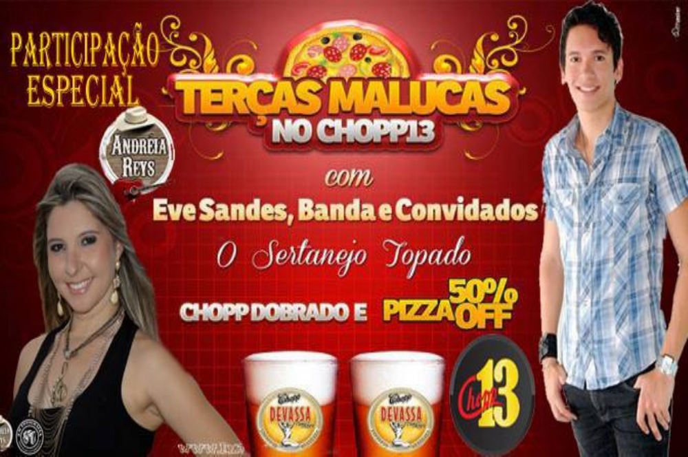 O cantor Eve Sandes comanda a Terça Maluca que acontece semanalmente no Chopp 13. Com muita irreverência e alto astral, o “sertanejo topado” e seus convidados levam ao público o melhor do sertanejo universitário. Nesta terça-feira, 6, a particpação especial será da cantora Andreia Reys.