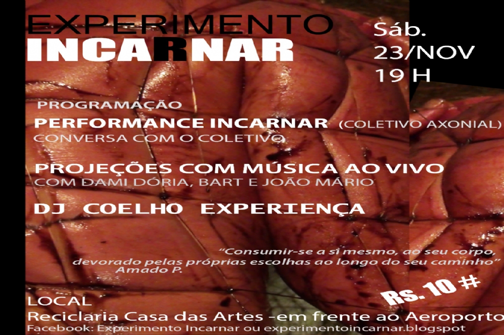 O coletivo Axonial coloca a mostra dos seus sentidos o processo colaborativo em performance : “INCARNAR” configurado em 2013. Aonde pretende-se experimentar de forma artística e reflexiva o consumo deliberado de “carnes”, toda, e de qualquer tipo: animal, humana ou até mesmo cultural. Acionando um corpo político, em sua estética e em seu fazer. Agora tomados pelo ato potente da performance, refletimos em objeção aos corpos passivos, docilizados, adormecidos e mecanizados. Ao corpo da ação-reação, refletindo hábitos impotentes, o sentindo de cada escolha que fazemos. Seu porquê. Sua genealogia. E realmente posicionar-nos de frente com o que consumimos perguntando a este Quem eres e de onde vens? Aonde me levaras? Ato – consciência. Escolha.