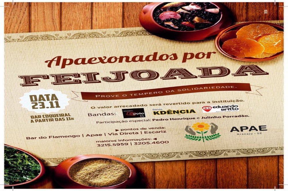 Com o tema “Apaixonados por Feijoada”, a Associação de Pais e Amigos dos Excepcionais de Aracaju – APAE promoverá no sábado, 23/11, a terceira edição de sua tradicional feijoada no bar e restaurante Coqueiral, localizado na Passarela do Caranguejo, na Orla de Atalaia.