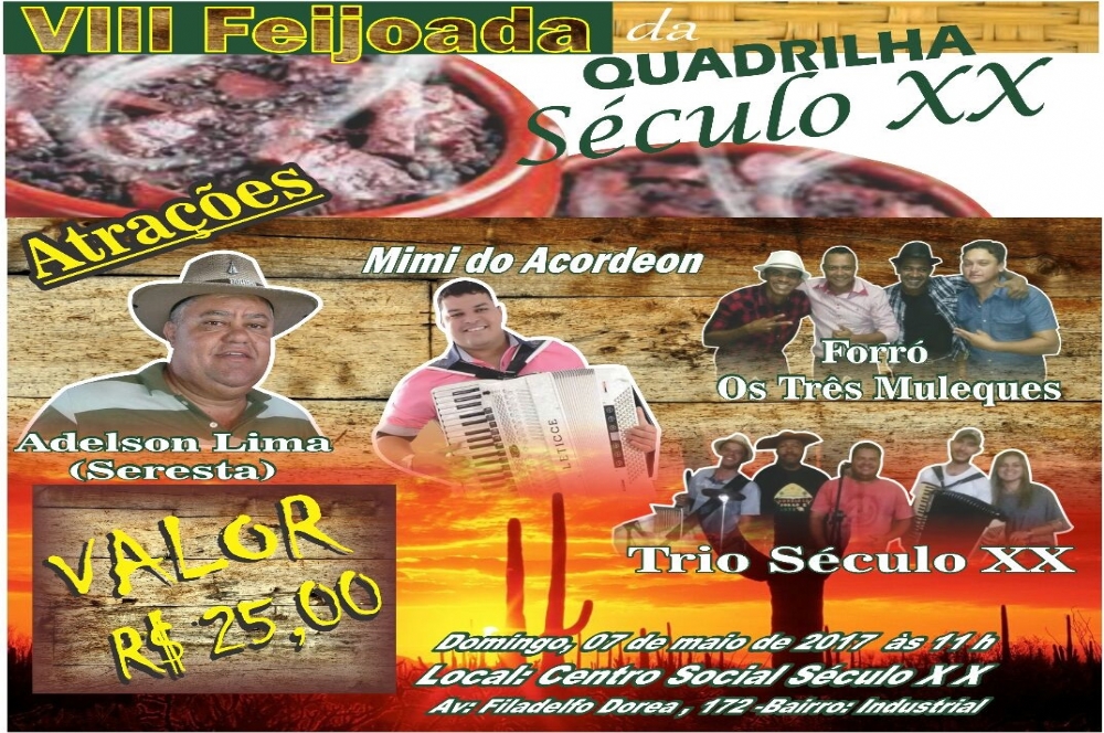 A Quadrilha Século XX promete um domingo inesquecível no dia 7 de maio. É que nessa data acontece no Centro Social Século XX, a tradicional feijoada da quadrilha. O evento terá trios pé de serra e diversos convidados.