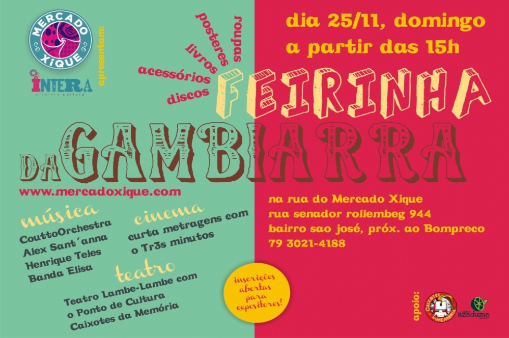 Acontece no próximo domingo, 25 de novembro, a Feira de Rua, chamada Feirinha da Gambiarra. O evento será aberto ao público e feito pra quem está cansado dos domingos chatos e quer curtir um programa diferente. A ideia é reunir num mesmo cenário um grande bazar de novos criadores e produtos sergipanos como: brechós, discos, livros, bolsas, acessórios e tudo que traga uma pitada criativa.