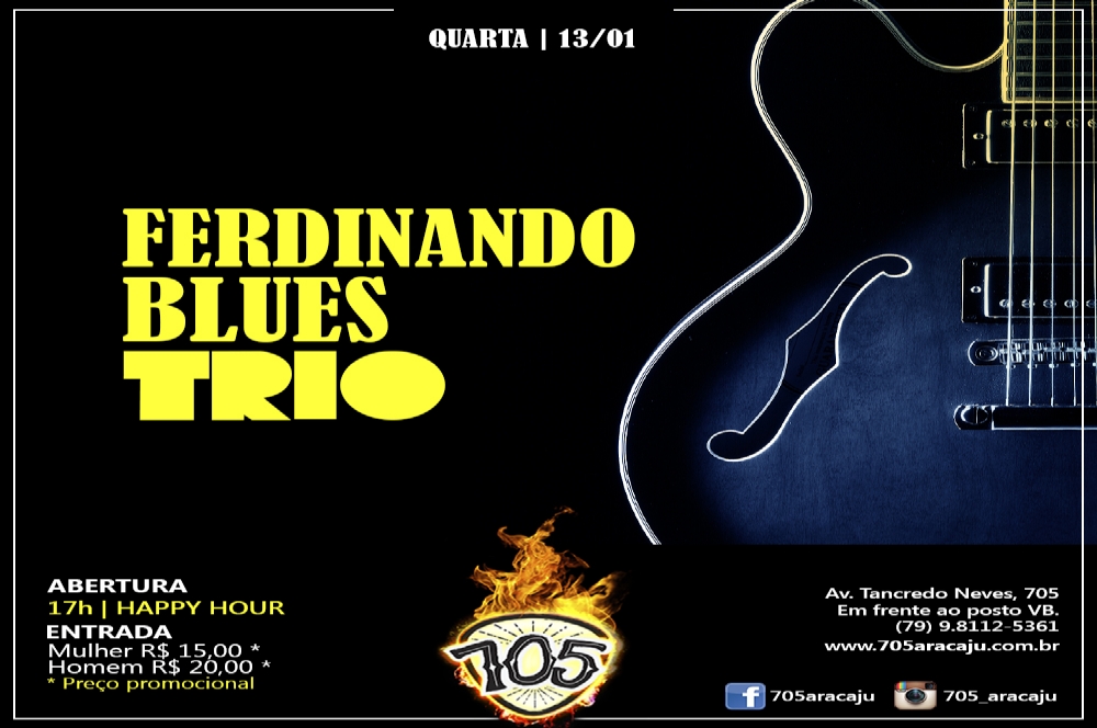 Nesta quarta-feira, 13, Ferdinando Blues Trio comandará o som no pub 705. O trio, que está na estrada a alguns anos, vem conquistando e cativando o público da cena sergipana.