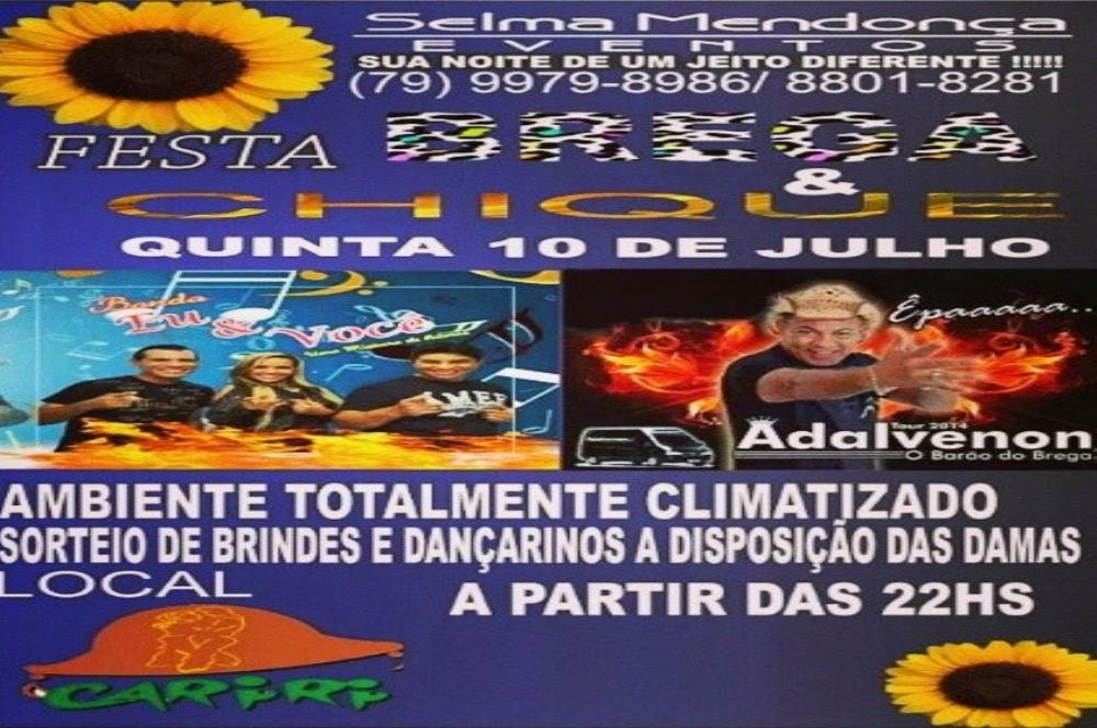 A Festa Brega e Chique acontece no dia 10 de julho, a partir das 22h, na Casa de Forró Cariri. A banda Eu & Você e o cantor Adalvenon agitam a festa que terá dançarinos à disposição das damas, sorteio de brindes e eleição do casal mais brega.