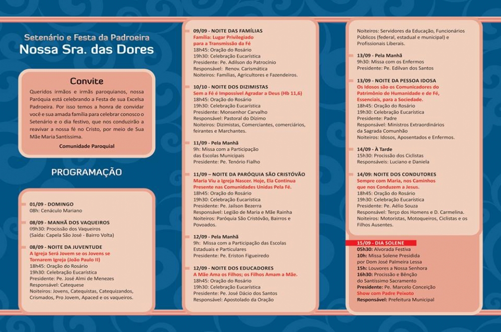A cidade de Nossa Senhora das Dores estará em festa no período de 08 à 15 de setembro, uma festa de tradição e pura religiosidade.