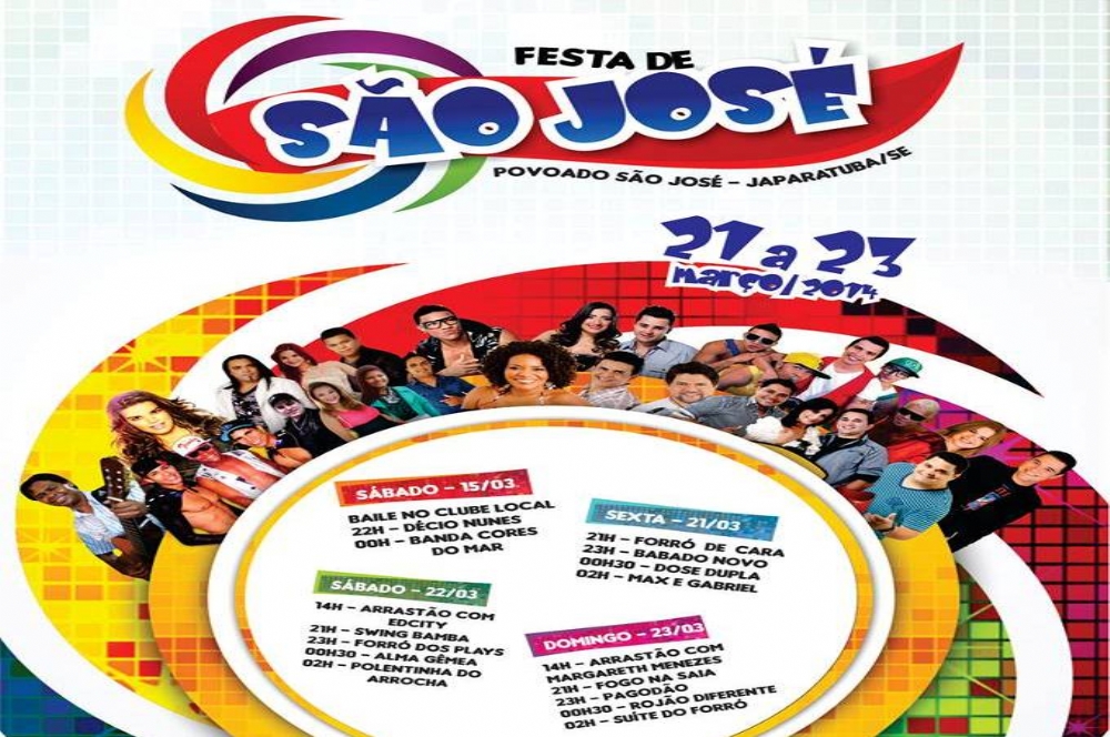 Acontece neste final de semana a tradicional festa social em homenagem ao padroeiro São José, no povoado de Japaratuba que recebe o mesmo nome do santo. Entre os dias 21, 22 e 23, diversas atrações de renome nacional se apresentam no município, localizado a 54 km de Aracaju, garantindo a diversão dos moradores e visitantes.