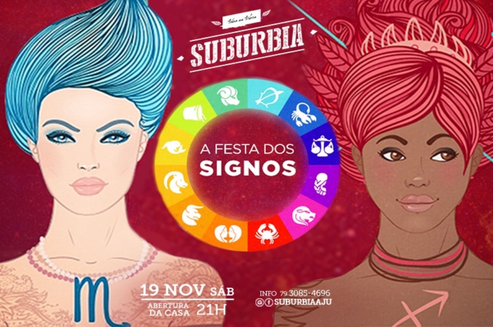 Dia 19 tem 'A Festa dos Signos', que já passou por mais 30 cidades. Show acontece no Suburbia, no sábado 19 de novembro, às 21h. Festa irá oferecer itens como adesivos de signos. Os ingressos antecipados podem ser adquiridos online ou na Litorial 655 do Shopping Jardins