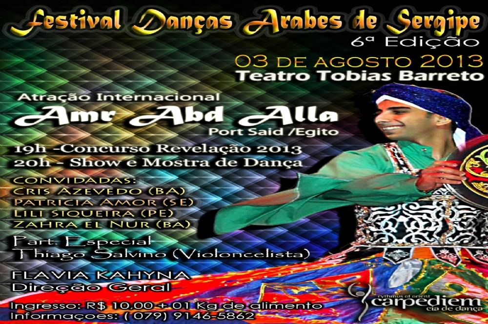 A 6ª Edição do “Festival Danças Árabes de Sergipe” traz a Aracaju, pela primeira vez, bailarino, professor e coreógrafo Ali Khalih. Este é o primeiro bailarino brasileiro reconhecido na Europa, além de realizar diversos cursos e apresentações em todo o Brasil. O evento acontece a partir das 19h, no Teatro Tobias Barreto.