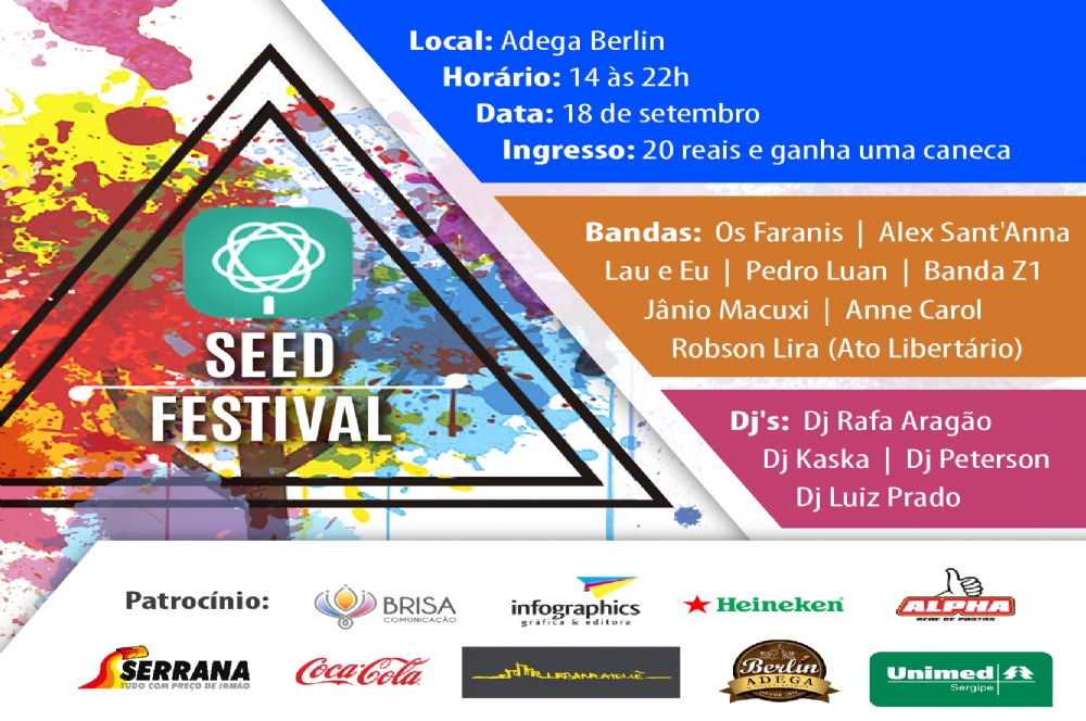Um festival com muita música e que busca arrecadar fundos para instituições. Foi com esse propósito que surgiu o Seed Festival, um evento que em sua primeira edição já traz mais de dez atrações, entre Dj’s e bandas sergipanas. A instituição beneficiada dessa vez, é o Instituto Canto Vivo. O evento acontece no dia 18 de setembro, na Adeba Berlin. Ingressos antecipados custam R$ 20.