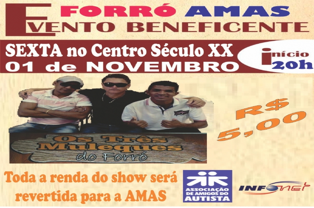 A Associação de Amigos Autista em Sergipe (AMAS), mais uma vez, estará realizando nesta sexta, 01 de novembro, a partir das 20h, no Centro Social Século XX, Forró beneficente com “Os 3 Moleques do Forró”. Os convites, que custam R$ 5,00, podem ser adquiridos pelo telefone 3255-2602 ou na portaria no dia. O objetivo é arrecadar fundos em prol da entidade que apoia pessoas com deficiência física e mental em Sergipe. Segundo o presidente da associação Joel Reis de São Pedro, todo o dinheiro arrecadado será utilizado para reformar a entidade, assim como adaptar o prédio às necessidades dos pacientes.