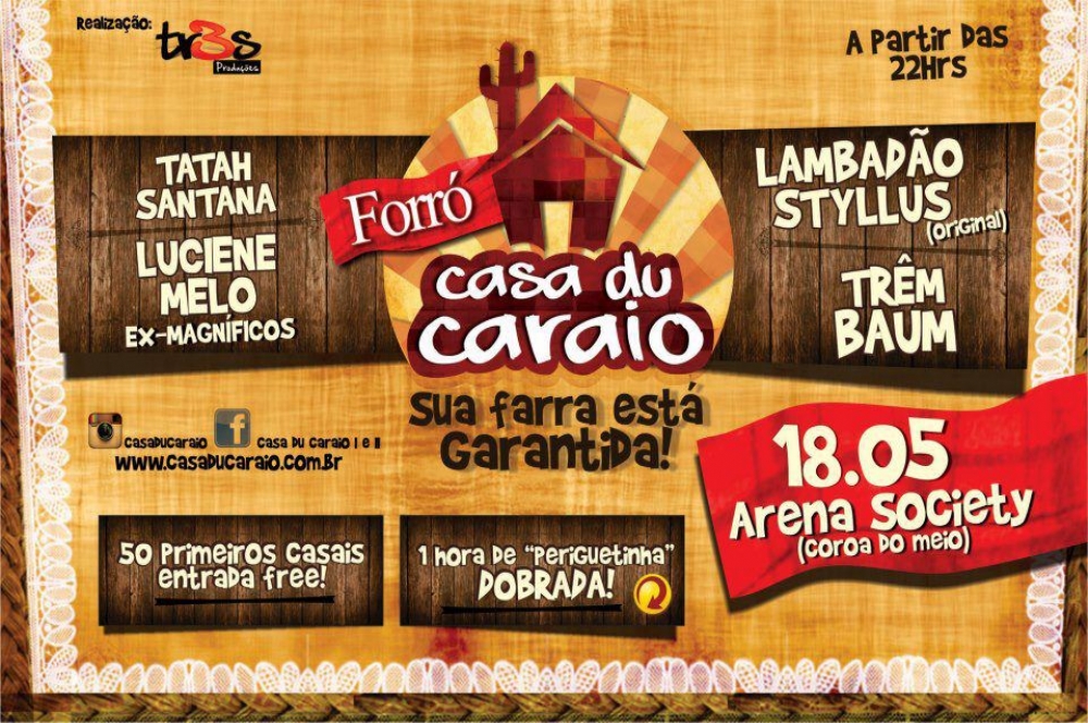 Dia 18 de Maio (Sábado), no Arena Society (Coroa do Meio), a Tr3s Produções e a Casa Ducaraio estará realizando a terceira edição do Forró da Casa Du Caraio. Em 2013, a festa contará com as apresentações das bandas Lambadão Styllus, Luciene Melo (ex-Magníficos), Trêm Baum e Tatah Santana.