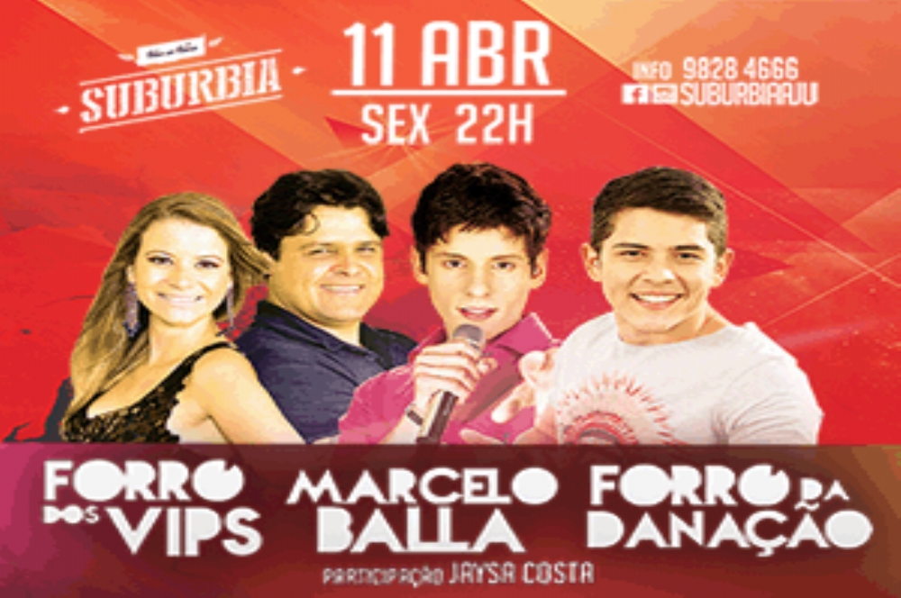 Na sexta-feira, 11, tem forró pra dar e vender na casa de todas as tribos. O Subúrbia selecionou as bandas Forró dos Vips, Marcelo Balla e Forró da Danação, a partir das 22h, com direito a participação de Jayza Costa, pra começar a diversão do fim de semana. Sem contar que no domingo, 13, tem Forró Fidapé e Banda Perfil 10, a partir das 14h, para a grande final entre Flamengo e Vasco. Todos os ingressos estão sendo vendidos no Bonaparte (Riomar) e Auto Peças Macedo (Hermes Fontes).