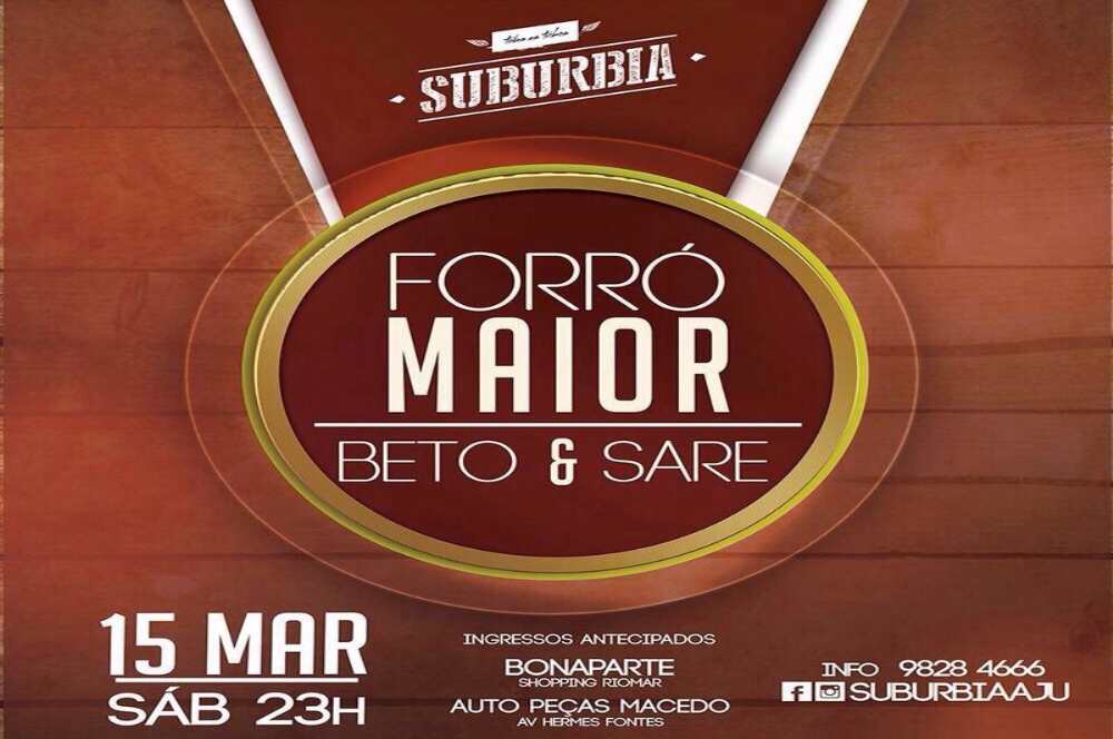No sábado, 15, a partir das 23h, o agito no Suburbia ficará por conta da banda Forró Maior e da dupla Beto & Sare. Os ingressos para os dois eventos estão à venda Auto Peças Macedo (Hermes Fontes) e Bonaparte (Riomar).
