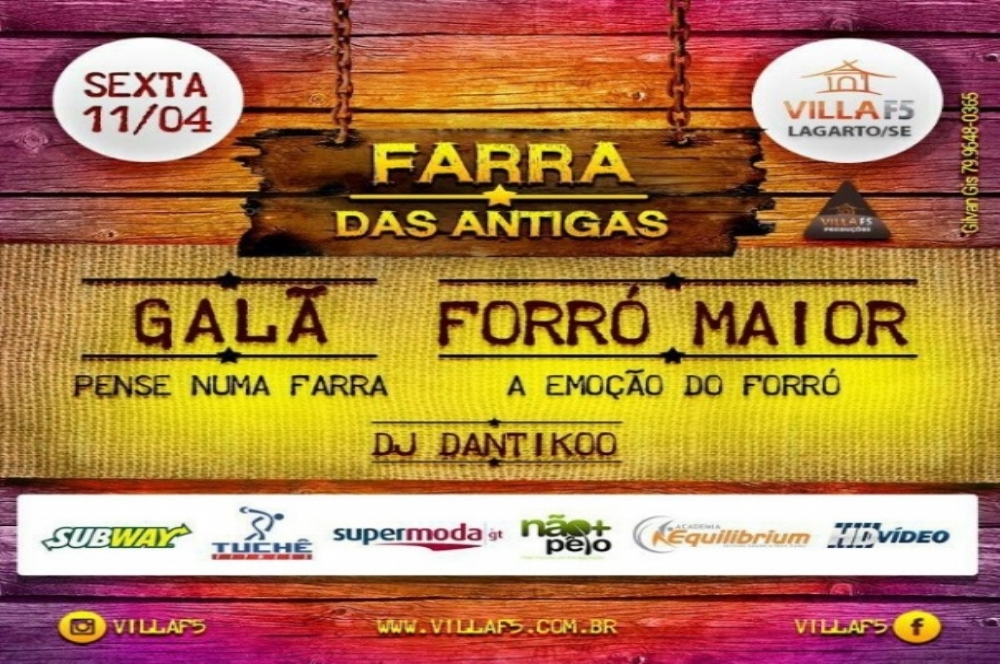 Na sexta-feira, dia 11 de abril, as bandas Forró Maior e Galã do Brega tomarão conta da casa de show mais badalada de Lagarto, o Villa F5. A farra das antigas já está em seu 2º lote com a pista por R$ 30 e camarote por R$ 45. Em Lagarto, os ingressos estão sendo vendidos no Subway, Tuchê Fitness e Super Moda.