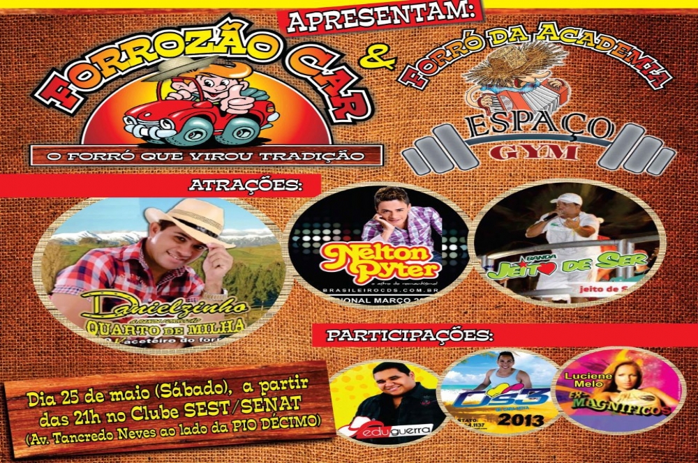 No dia 25 de maio acontece o Forrozão Car e o Forró da Academia Espaço Gym. A festa que virou tradição será realizada a partir das 21h, no Sest Senat (Avenida Tancredo Neves). Entre as atrações, Danielzinho e Forrozão Quarto de Milha, Nelton Pyter, Banda Jeito de Ser, além de participações de Edu Guerra, Os3 e Luciene Melo (ex-Magníficos).