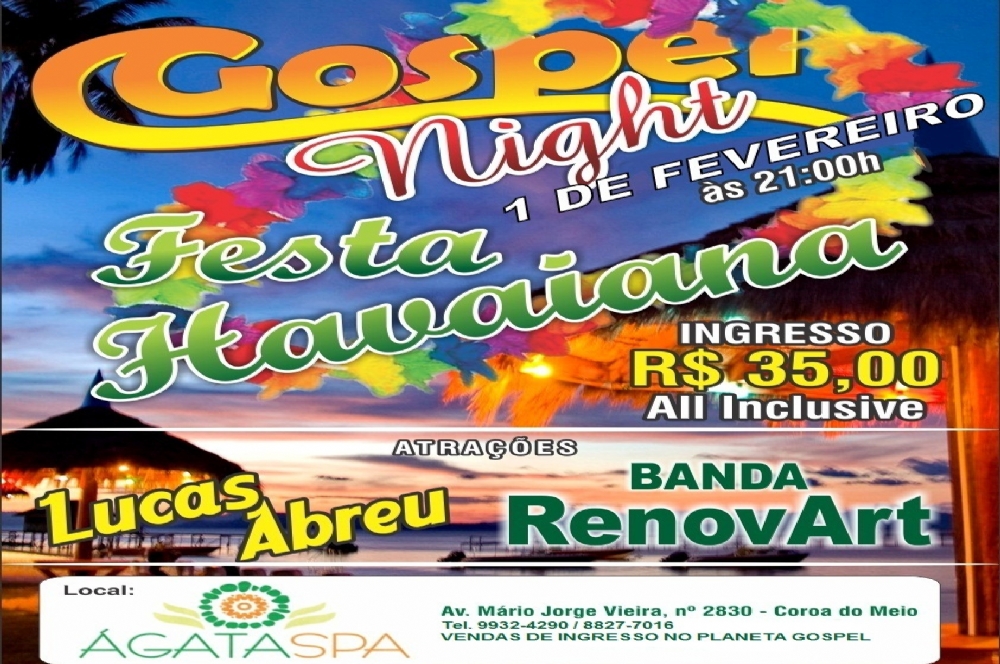 O Gospel Night ocorrerá no sábado, dia 1º, às 21h, no Ágata SPA. As atrações serão DJ Lucio, Lucas Abreu e a Banda Renovart. O evento será temático, "Festa Havaiana". Os ingressos limitados custam R$ 35 (all inlusive) e estão sendo vendidos nas lojas Planeta Gospel ou pelo telefones 9932-4290 / 8827-2026 / 3255-4324.
