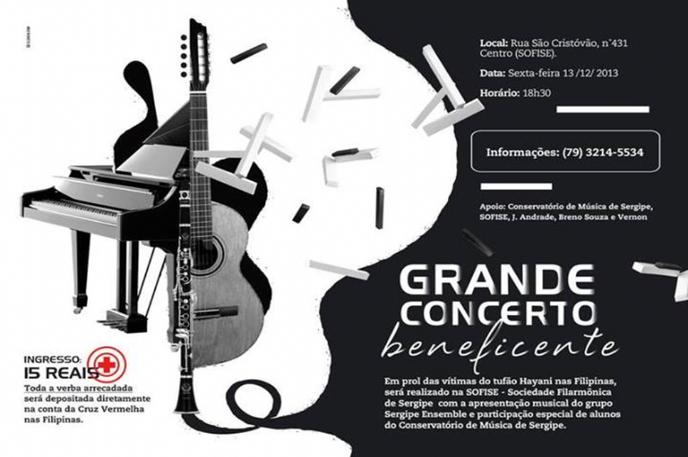 No próximo dia 13 de dezembro, às 18h30, acontecerá na sede da Sociedade Filarmônica de Sergipe (Sofise), um Concerto Beneficente em prol das vítimas do tufão Haiyan, que passou pelas Filipinas no último dia 08 de novembro e deixou milhares de mortos e cerca de quatrocentas mil pessoas desabrigadas.