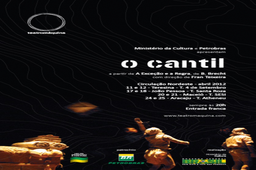 O grupo cearense Teatro Máquina apresentará nos dias 24 e 25 de abril às 20h o espetáculo ‘O Cantil’. A apresentação fala sobre uma viagem sem espaço nem tempo definidos, em que dois homens seguem à procura de algo. Para um deles, o patrão, a viagem é urgente e aterradora, já para o empregado, é apenas objeto de seu ganha-pão. Entre os dois se estabelece uma relação nos extremos da desconfiança total e da pura subserviência, relação essa transfigurada pela ausência/presença do cantil.