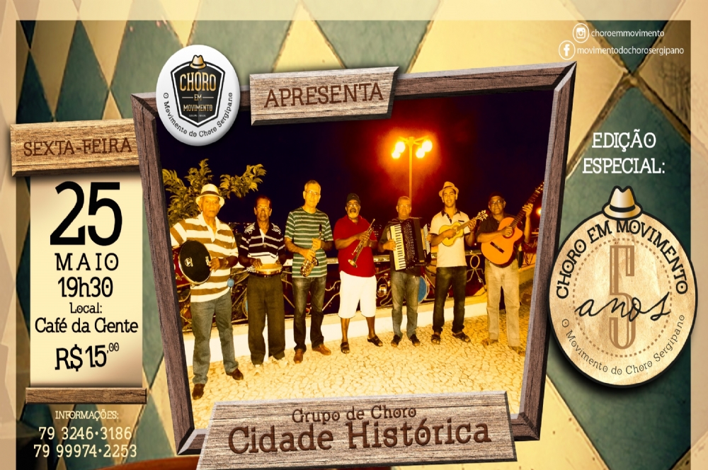 O grupo ‘Cidade Histórica’ vai se apresentar no Café da Gente, na sexta-feira, 25, a partir das 19h30. A apresentação faz parte projeto ‘Choro em Movimento’, que é do Movimento do Choro Sergipano. Os ingressos custam R$ 15 e as informações podem ser obtidas por meio do telefone (79) 3246-3186 ou 9 9974-2253.