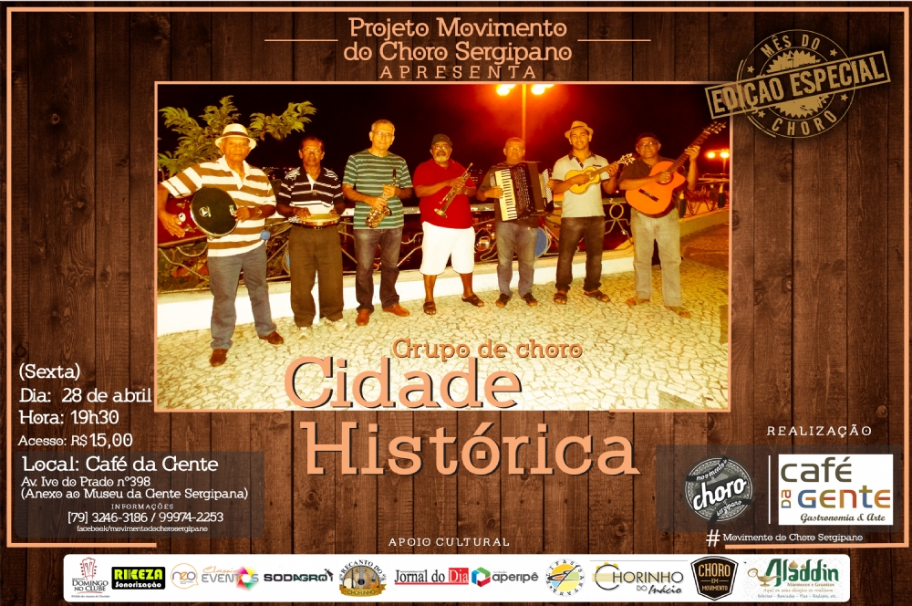 O Grupo de Choro Cidade Histórica vai se apresentar no Café da Gente na próxima sexta-feira, 28, a partir das 19h30. O show faz parte do projeto ‘Movimento do Choro Sergipano’. Este mês as apresentações celebram o mês de choro e os 12 anos do Mestre Pixinguinha.