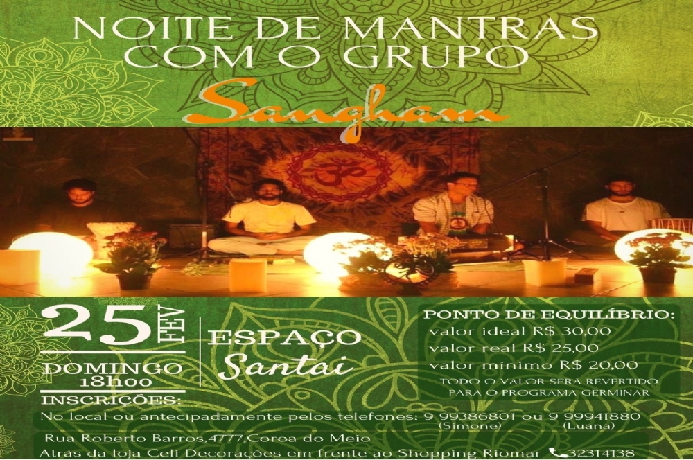 O grupo Sangham vai promover uma ‘Noite de Mantras’ no próximo domingo, 25. Ao som de instrumentos de percussão, o evento será realizado na rua Roberto Barros, nº 4777, bairro Coroa do Meio.