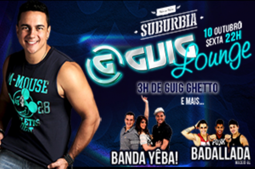 O Guig Lounge vai fazer o Suburbia tremer com três horas de show na próxima sexta-feira, 10 de outubro. Téo Santana Produções traz Guig Guetto, Banda Yeba! e Badallada (Maceió) para agitar a casa até o dia amanhecer. Por isso, é bom ir preparado. A banda baiana promete fazer um show inesquecível de três horas de duração. Ingressos antecipados à venda na Auto Peças Macedo da Avenida Hermes Fontes e no Bonaparte do RioMar Shopping.