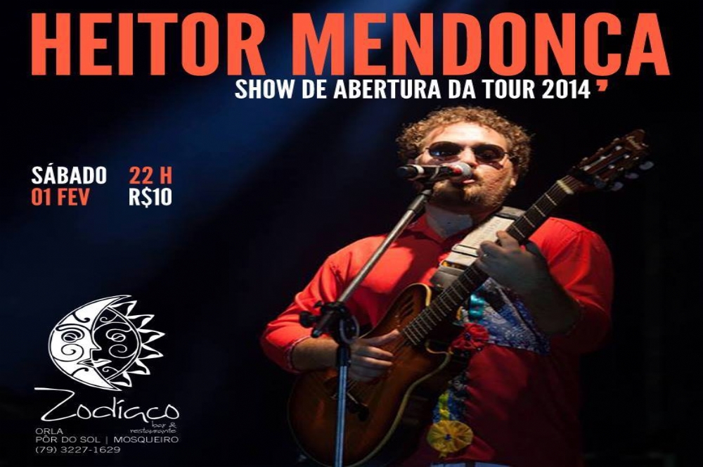 O sergipano Heitor Mendonça inicia sua Tour 2014 com um belo show no no Zodíaco Bar e Restaurante, na orla Pôr do Sol, Mosqueiro. O evento acontece neste sábado, 1º, a partir das 22h. O cantor fará sua apresentação acompanhado do guitarrista Saulo Ferreira, do baterista James Bertisch e do bandolinista Fernando Freitas. No repertório, o melhor das canções do CD Heitor Mendonça e também canções inéditas.