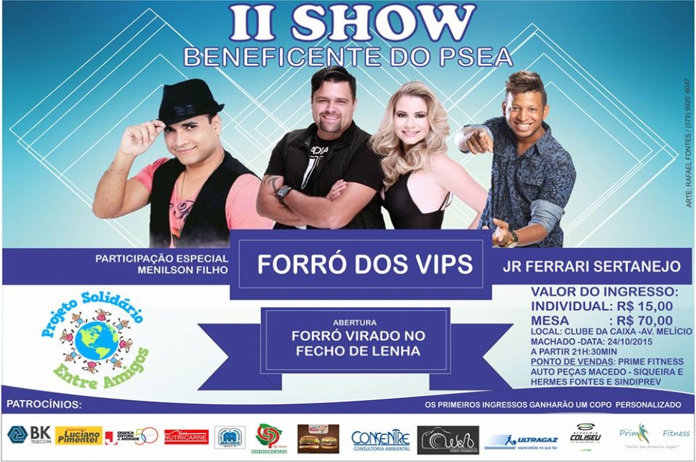 O II Show Beneficente do Projeto Solidário entre Amigos (Psea) acontece no dia 24 de outubro, a partir das 21h30, no Clube da Caixa, na avenida Melício Machado, bairro Aruana. O agito fica por conta das bandas Forró Dos Vips, Forró Fecho de Lenha e dos Junior Ferrari e Menilson Filho.
