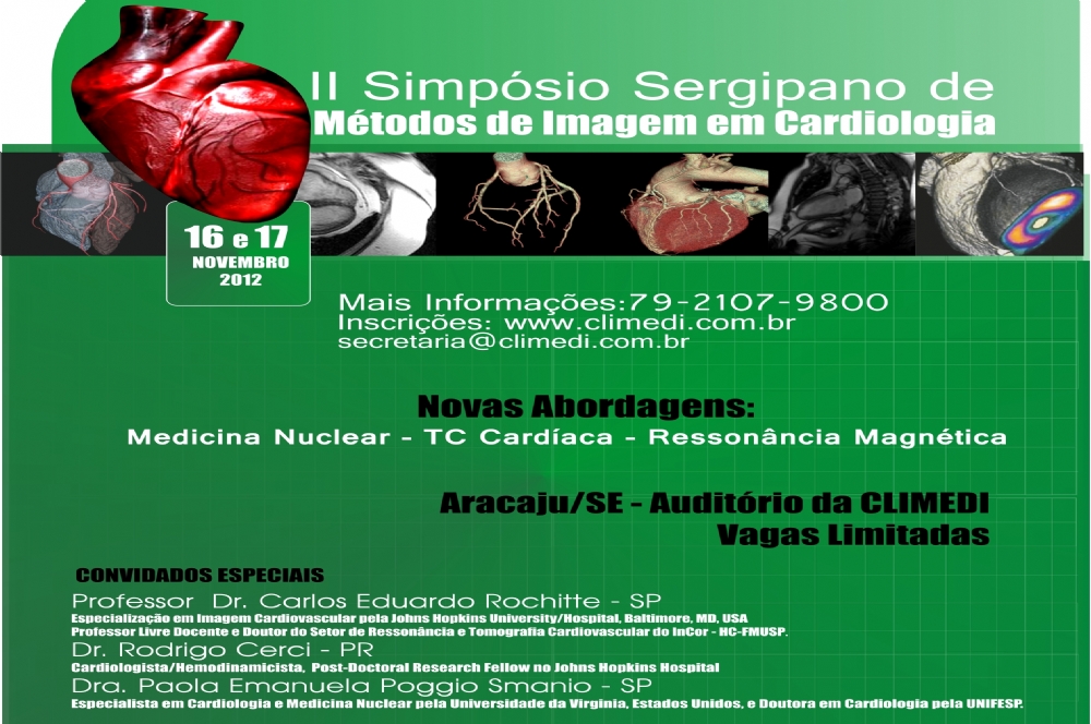 Aracaju receberá nos dias 16 e 17 de novembro, o II Simpósio Sergipano de Métodos de Imagens em Cardiologia (ressonância miocárdica, Angio Tc coronariana e cardiologia nuclear). O evento, que tem como público alvo cardiologistas, estudantes e outros profissionais de áreas afins, contará com a participação do Professor Dr. Carlos Eduardo Rochitte – SP, Dra. Paola Smanio – SP e o Dr. Rodrigo Cerci – PR, além de cardiologistas sergipanos.