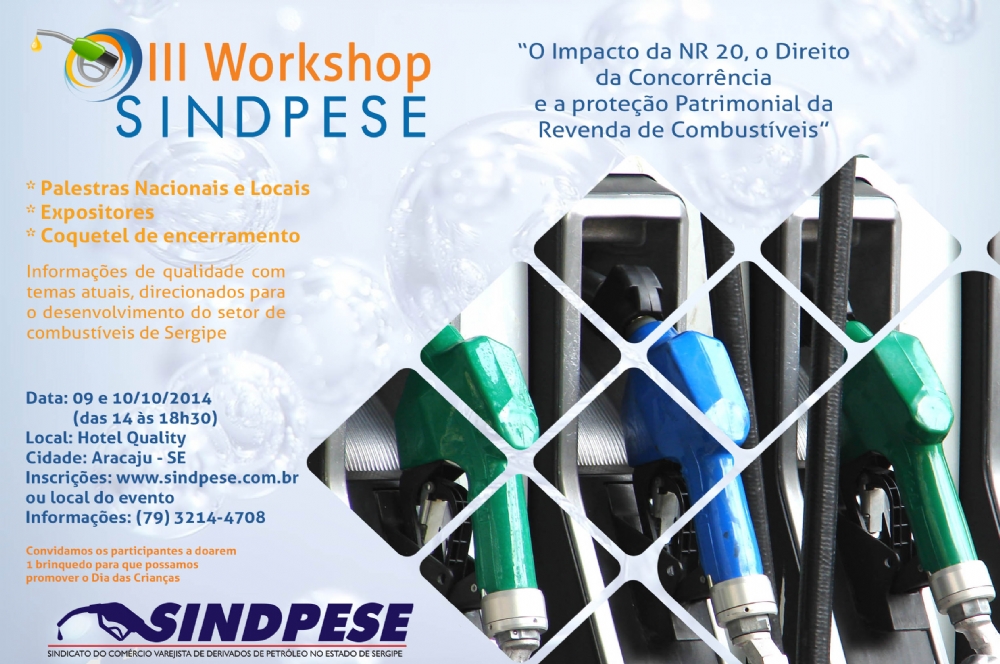 O Sindicato do Comércio Varejista de Derivados de Petróleo no Estado de Sergipe – SINDPESE está promovendo o “III Workshop Sindpese” que acontece dias 9 e 10 de outubro, no Quality Hotel Aracaju, e traz além de informações de qualidade, temas escolhidos com base nas demandas atuais e no princípio da manutenção e desenvolvimento do setor de combustíveis de Sergipe.