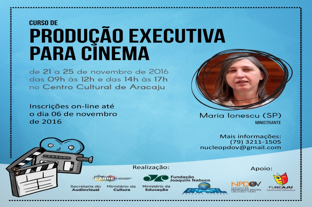 Estão abertas as inscrições para o curso de Produção Executiva, ministrado por Maria Ionescu, que acontecerá no Núcleo de Produção Digital Orlando Vieira no período de 21 a 25 de novembro de 2016, das 9 às 12h e das 14h às 17h. As inscrições devem ser feitas até o dia 6 de novembro através do link: http://www.fundaj.gov.br/images/stories/canne/editais2016/edital_producaoexecutiva_aracaju_2016.pdf.