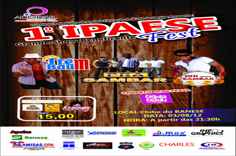 O 1º IPAESE Fest é um evento beneficente em prol da instituição, e vai ser realizado no dia 3 de agosto, às 21h30, no clube do Banese. A festa vai contar com a participação das bandas Forró Trêm Baum, Pra Sambar e Dhi Sambar.