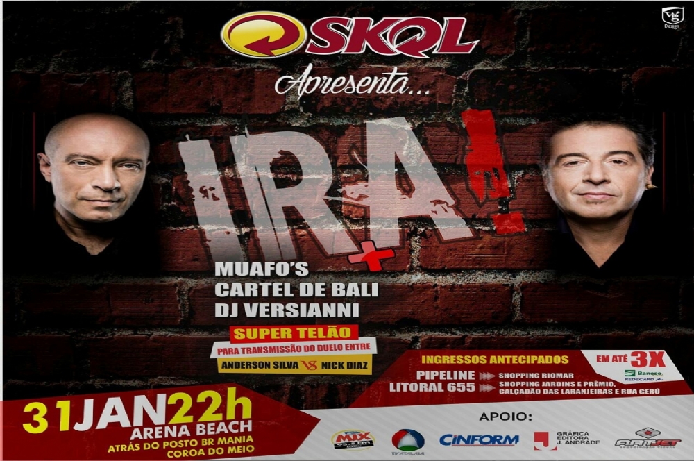Ira, Muafo’s, Cartel de Bali e o Dj Versianni são as atrações do Ira Premium que acontece no dia 31 de janeiro, a partir das 22h, na Arena Beach, em frente ao Shopping Riomar. Participe da promoção do Portal Infonet e concorra a ingresso.
