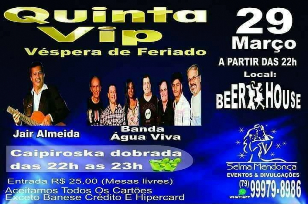 A véspera de feriado na casa de show Beer House terá shows de Jair Almeida e Banda Água Viva. O evento acontece nesta quinta-feira, 29, a partir das 22h. A casa fica na Orla de Atalaia e os ingressos custam R$ 25. Informações podem ser obtidas por meio do telefone (79) 99979 8986.