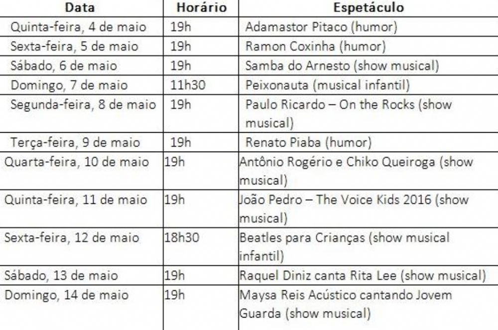 A programação contará com espetáculos dos humoristas Ramon Coxinha e Renato Piaba, a boa música do Samba do Arnesto, do ex-RPM Paulo Ricardo, do projeto Beatles para Crianças e dos sergipanos Antônio Rogério e Chiko Queiroga, Raquel Diniz, Maysa Reis e João Pedro – participante do The Voice Kids 2016 -, além do musical infantil Peixonauta.