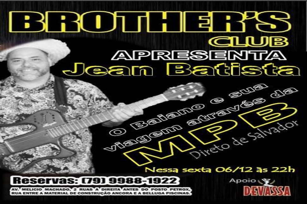 Direto de Salvador, Jean Batista, estará em Aracaju para fazer uma viagem pela MPB. O show acontece na sexta-feira, 6, a partir das 22h, no Brother’s Club. O Brother’s Club está localizado nas imediações da Avenida Melício Machado, precisamente na Rua E, nº 216/ duas ruas antes do Posto Petrox, rua entre o Âncora Material De Construção e Belluga Piscinas.