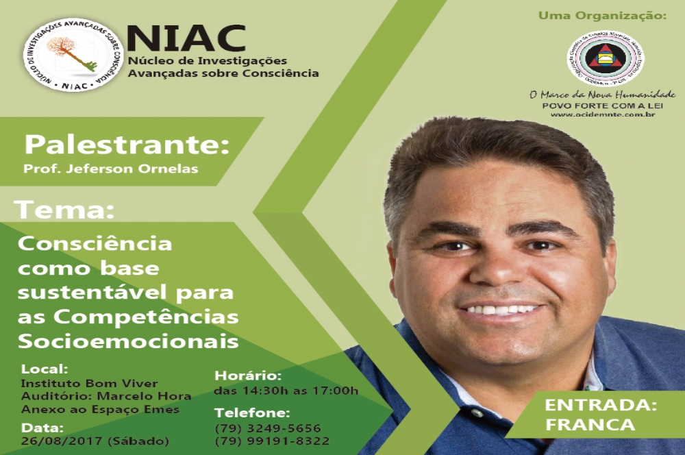 O professor Jeferson Ornelas vai ministrar a palestra ‘Consciência como base sustentável para as competências socioemocionais’. O evento acontece no dia 26 de agosto, das 14h30 ás 17h, no auditório Marcelo Horas, anexo ao Espaço Emes. Informações pelo telefone (79) 3249 5656 e 99191 8322. A entrada é gratuita.