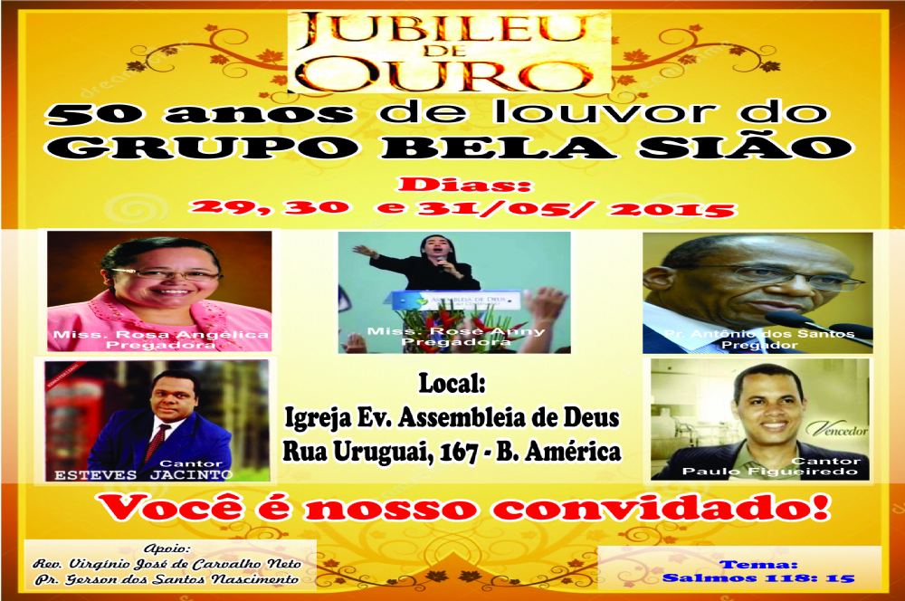 Na sexta-feira, 29, sábado, 30 e domingo, 31, acontece a festa do Jubileu de Ouro do Grupo Bela Sião da Igreja Evangélica Assembleia de Deus.