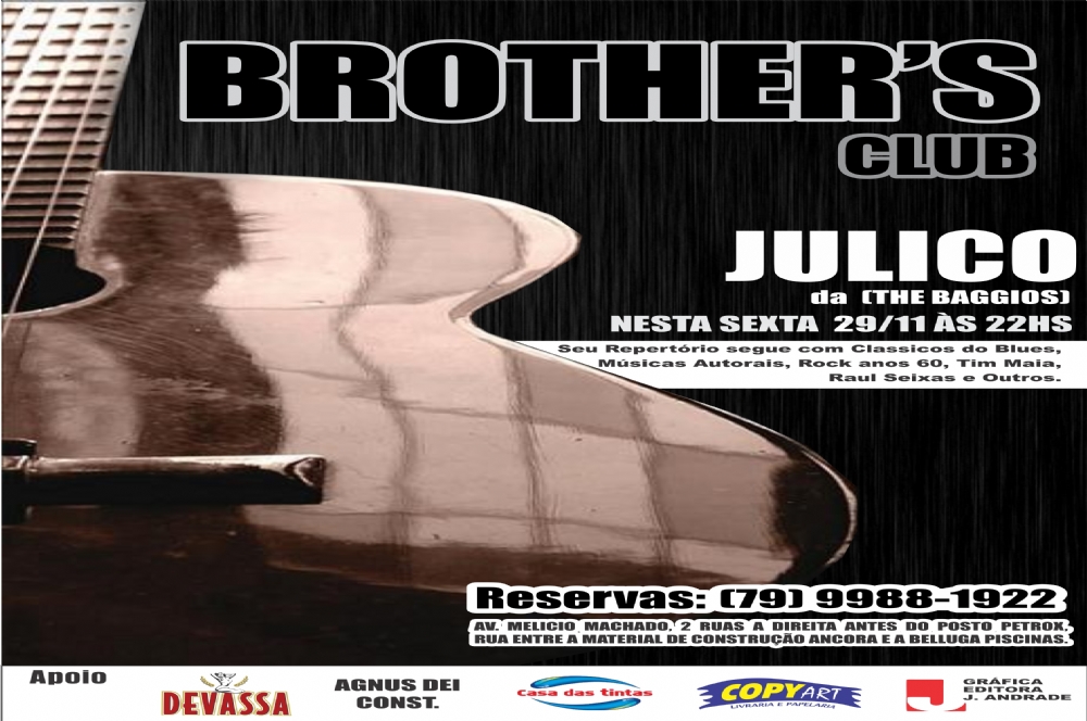 Julico (The Baggios) fará um show acústico nesta sexta-feira, 29, no Brother’s Club. No repertório, músicas autorais, clássicos do blues, rock dos anos 60 e músicas de Raul Seixas, Tim Maia, dentro outros.