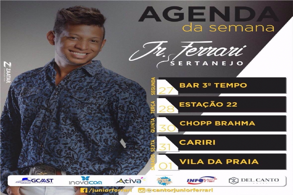 Que Júnior Ferrari é a revelação do sertanejo sergipano, isso todo mundo já sabe, o que quase ninguém sabe, é que ele canta nas noites de Aracaju diariamente, sem direito a folga. Ele e toda sua banda não param, literalmente! Cariri, Estação 22, Chopp Brahma, Vila da Praia, Armazém da Avenida e Vila Botequim, são alguns dos points fixos que o cogitado Ferrari solta a sua linda voz para os corações apaixonados. Júnior Ferrari faz apresentações não só em Sergipe, como fora do Estado também, são os nossos artistas sergipanos voando alto. Fique ligado na agenda do Ferrari para essa semana!