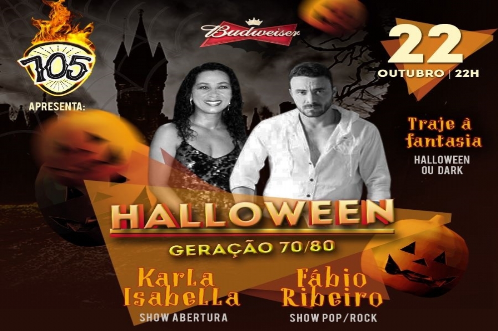 Karla Isabella e Fábio Ribeiro são as atrações do Halloween 70/80 da 705 PUB. O evento acontece no dia 22 de outubro, a partir das 22h. Os ingressos do 1º lote custam R$ 30 e estão à venda no Posto BR em frente ao 705 ou na Cacau Show do Shopping Jardins. Informações por meio do (79) 99997-3535.