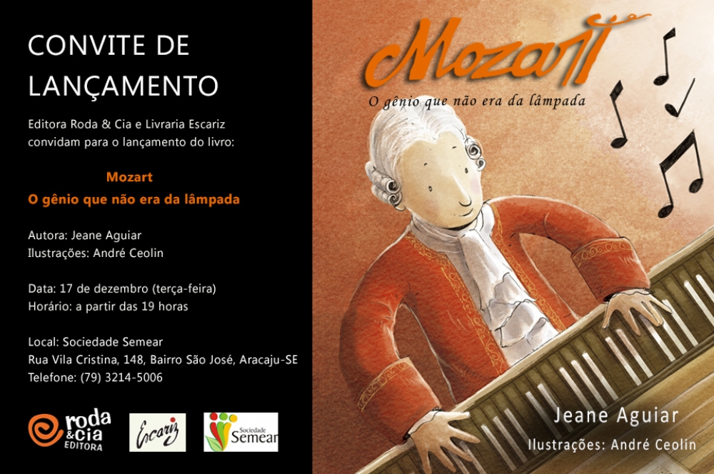 O lançamento do livro “Mozart – O Gênio que não era da lâmpada”, de autoria de Jeane Aguiar, acontece no dia 17 de dezembro, a partir das 19h, na Sociedade Semear, localizada na rua Vila Cristina, 148, bairro São José. Este é o quarto livro infantojuvenil da autora. Informações através do telefone (79) 3214 5006.