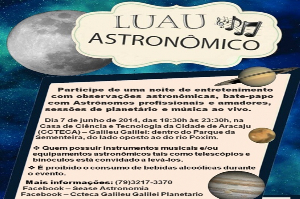 O Luau Astronômico será realizado no dia 7 de junho, a partir das 18h30, na Casa de Ciência e Tecnologia de Aracaju – Galileu, localizada dentro do Parque da Sementeira. O evento é uma iniciativa do do Departamento de Física da Universidade Federal de Sergipe (UFS), da CCTECA e Sociedade de Estudos Astronômicos de Sergipe (Sease).