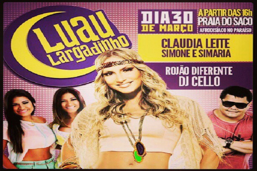 A cantora Claudia Leitte comandará no dia 30 de Março o Luau do Largadinho. A festa será realizada a partir das 16h nas areias da Praia do Saco e ainda terá atrações como Simone e Simaria, Rojão Diferente e DJ Cello. Os ingressos já estão a venda na Central do Pré-Caju no Shopping Riomar. Informações pelo telefone (79) 3219 2069.