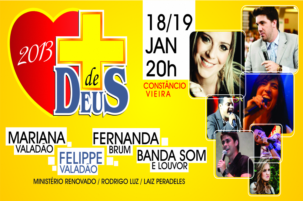 Contagem regressiva para o Mais de Deus 2013. O evento cristão é organizado pela Igreja Presbiteriana Renovada e este ano acontece nos dias 18 e 19 desse mês no Ginásio Constâncio Vieira. Participações de Fernanda Brum, Mariana Valadão, Felippe Valadão, Banda Som e Louvor, Rodrigo Luz, Laiz Peradeles e Ministério Renovado. O ingresso custa (por noite): R$ 10,00. A camisa: R$15.