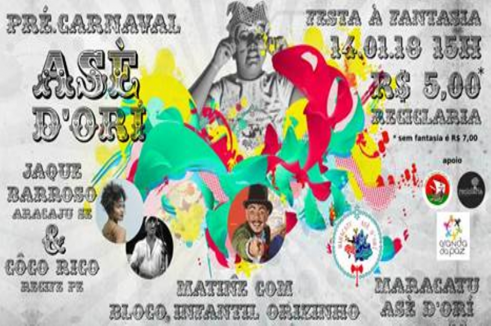 Em comemoração ao quarto ano de aniversário, o Maracatu Asè D'Orí abre alas para a folia de Momo com o Pré-Carmaval Asè d'Orí, na Reciclaria Casa de Artes. Além do já tradicional baque de maracatu, a festa vai contar com a presença de artistas de peso da cultura local sergipana, como Samba de Moça Só e Jaque Barroso, além do grupo Côco Rico, diretamente de Pernambuco. A festa será à fantasia, então se prepare e venha aquecer o passo com a gente!