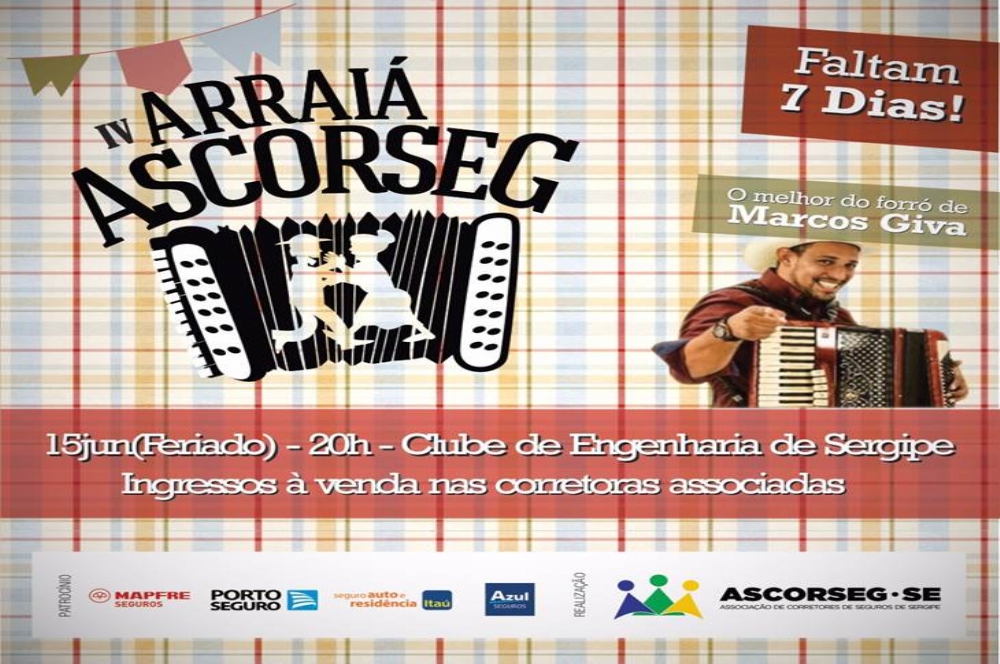 A 4ª edição da Festa Junina da Associação dos Corretores de Seguro de Sergipe (Ascorseg/SE) acontece no dia 15 de junho, a partir das 20h, no Clube de Engenharia de Sergipe, no bairro Atalaia.