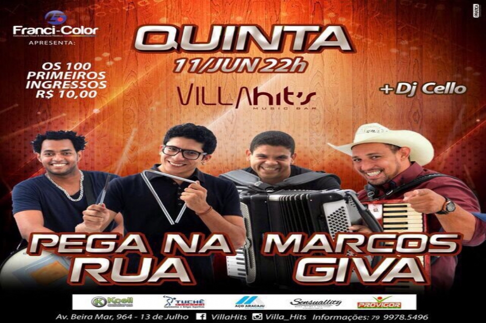 A quinta-feira desta semana, 11 de junho, do Villa Hits traz o cantor Marcos Giva e a banda ‘Pega na Rua’ com uma mistura de ritmos bem envolvente. A festa terá preço promocional para as 100 primeiras pessoas, que pagam apenas R$ 10 pelo ingresso.