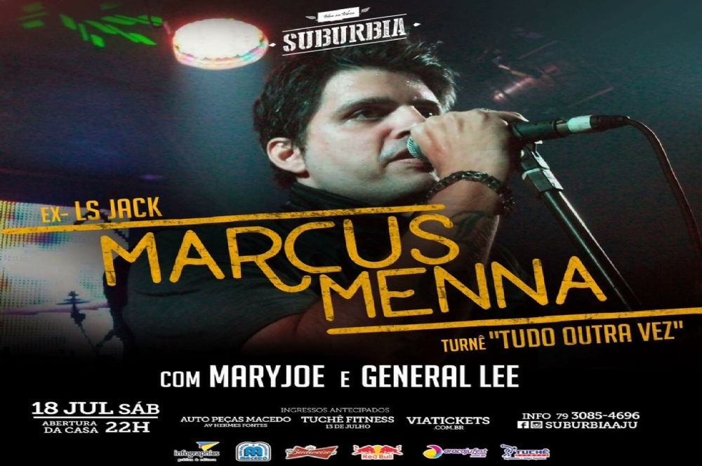 Depois de participar do show da banda MaryJoe no Badalando Rock, o ex vocalista da banda LS Jack, Marcus Menna, retorna à Aracaju em show solo para apresentar a turnê ‘’Tudo outra vez’ no dia 18 de julho no Suburbia. Além de Menna, a noite também vai contar com shows das bandas sergipanas MaryJoe e General Lee a partir das 22 horas.